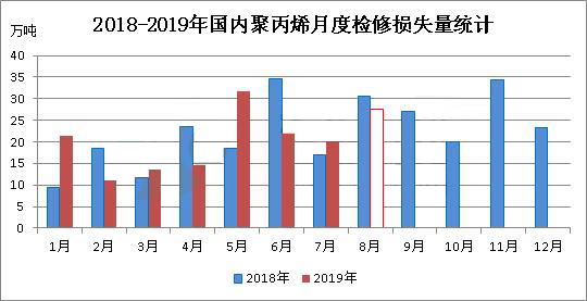 ????????2019年8月份,國內(nèi)聚丙烯檢修損失量預(yù)計(jì)在27.63萬噸,環(huán)比(2019年7月份20.12萬噸)增加7.51萬噸,增幅在37.33%;同比(2018年8月30.66萬噸)減少3.03萬噸,減少9.9%。2019年1-8月份,預(yù)計(jì)累積檢修損失量為162.15萬噸,較去年同期(2018年1-8月164.11萬噸)略有減少,降幅1.2%。