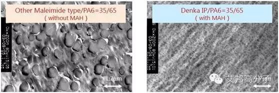 不含馬來酸酐相容劑/PA6=35/65(左)、IP相容劑(含馬來酸酐)/PA6=35/65(右),來源:DENKA電氣化學(xué)工業(yè)株式會社